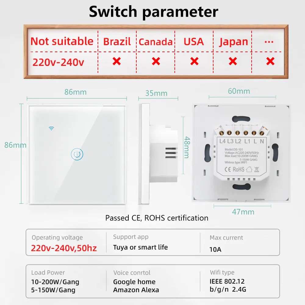 This EU Wifi smart touch switch with Single Fire Wire is suitable for single fire scenarios. It is easy to install and does not require rewiring. It supports app control and voice control. There are multiple specifications and colors to choose from. The material is waterproof, fireproof, scratch-resistant, safe, durable, and easy to maintain.