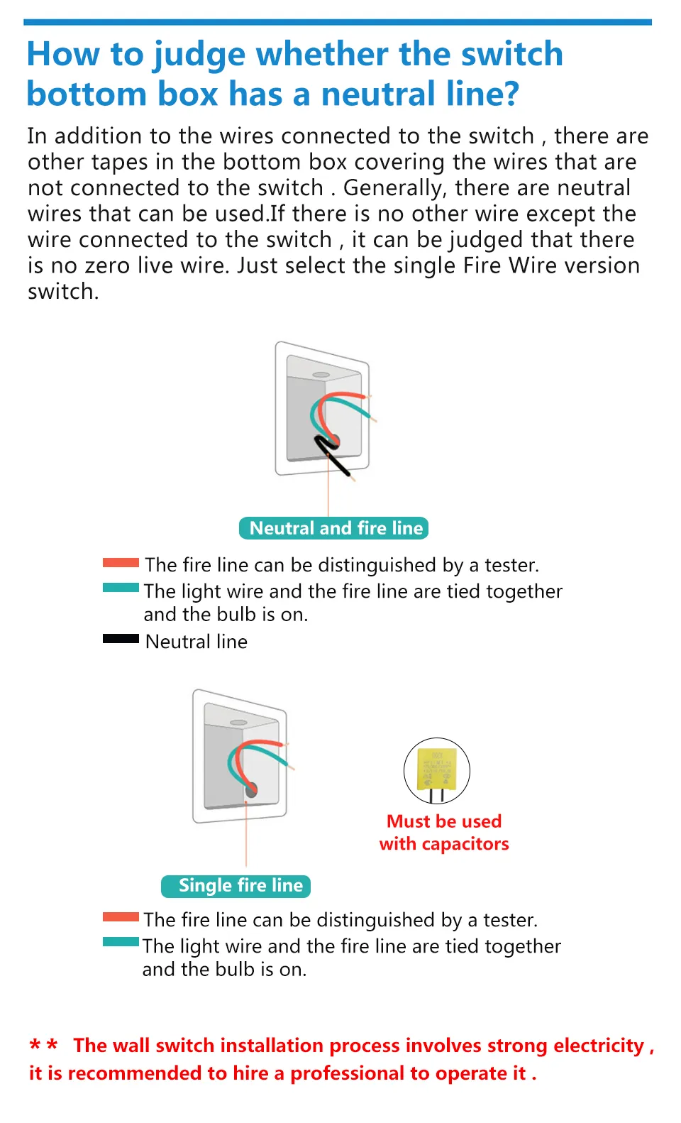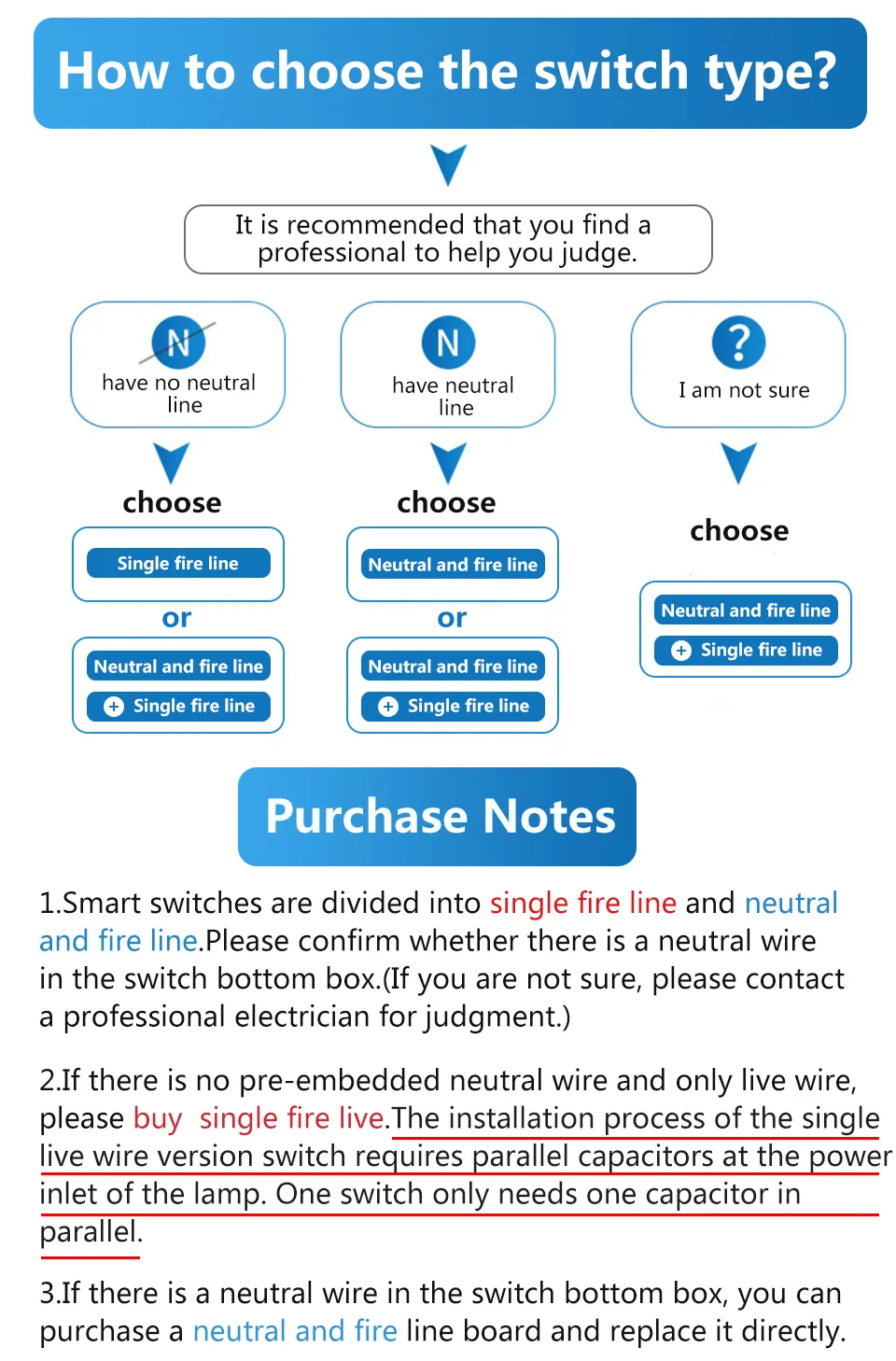 Before you purchase this smart switch, please confirm whether their is a neutral wire in the switch bottom box. If you want to a smart switch with neutral line, please refer to SLS EU WiFi Bluetooth Smart Touch Dimmer Switch with Neutral Wire.