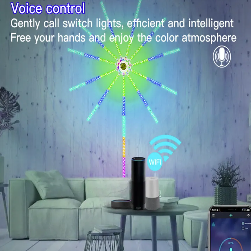 The smart LED strip light features music sync, customizable fireworks, adjustable brightness, and speed. It is perfect for e-sports, parties, and living rooms, and it has hands-free voice control for vibrant, dynamic lighting.
