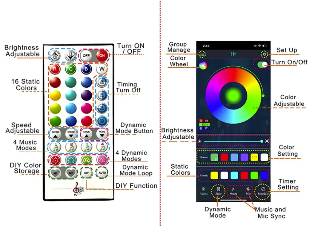 5. Voice Control: Effortlessly control your lights with simple voice commands. Free your hands and enjoy the colorful ambiance with efficient and intelligent voice control.